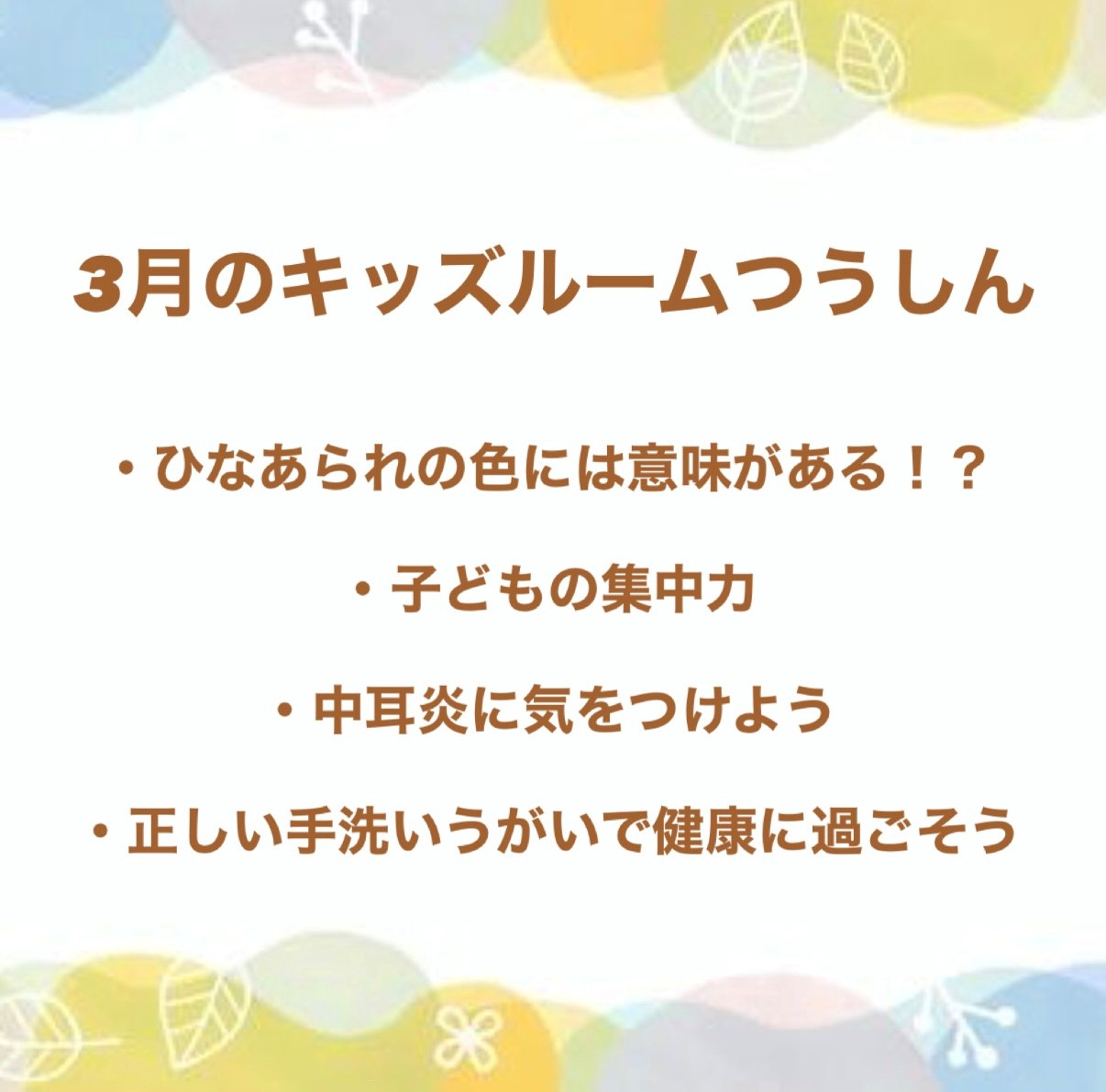 ~内容~ ・ひなあられの色には意味がある!? ・子どもの集中力 ・中耳炎に気を付けよう ・正しい手洗いうがいで健康に過ごそう