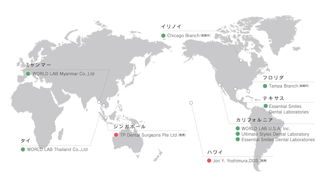 また、歯科技工の分野でも、日本、アメリカ(LA、ダラス)、ミャンマー、タイ(バンコク)に製造拠点やデザインセンターを持ち、世界各国の技工物の製造に携わらせていただいております。